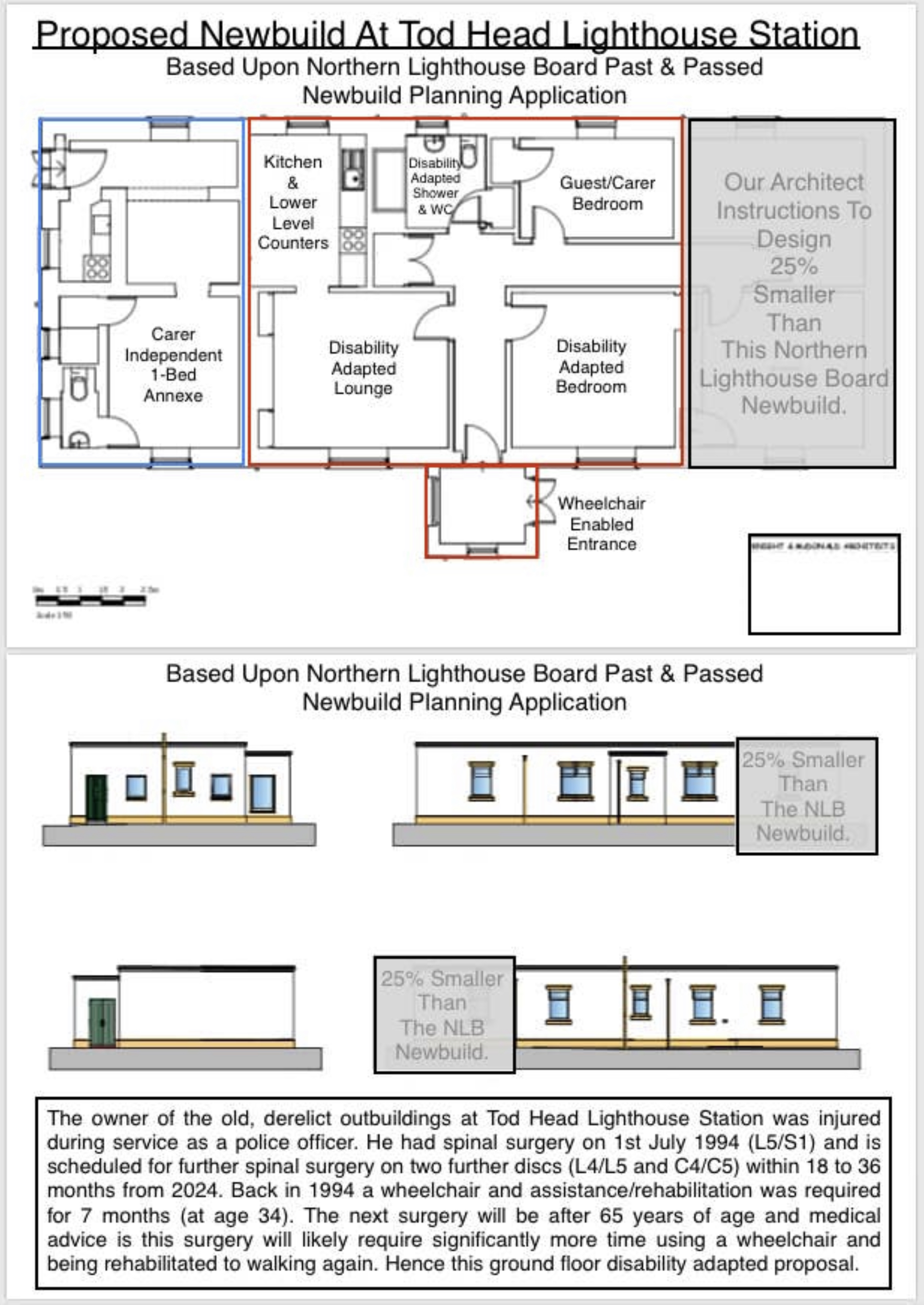 Flat-3 has been empty for several months due to the owner requiring (spinal) surgery. For full disclosure, historic surgery can be observed (gory bits): here, here, here and here. This is relevant as the owner of Flat-3 is only selling his home because the first floor stairs are now problematic due to spinal deterioration. As a consequence, the dilapidated ground floor bothy on the north-west of the compound (Marked “Outbuilding 1″ and two dilapidated wooden garages (Outbuilding 2” an “Outbuilding 3”) are to be demolished and in the old Bothy’s footprint, a specific design of the Northern Lighthouse Board vernacular is to be built.